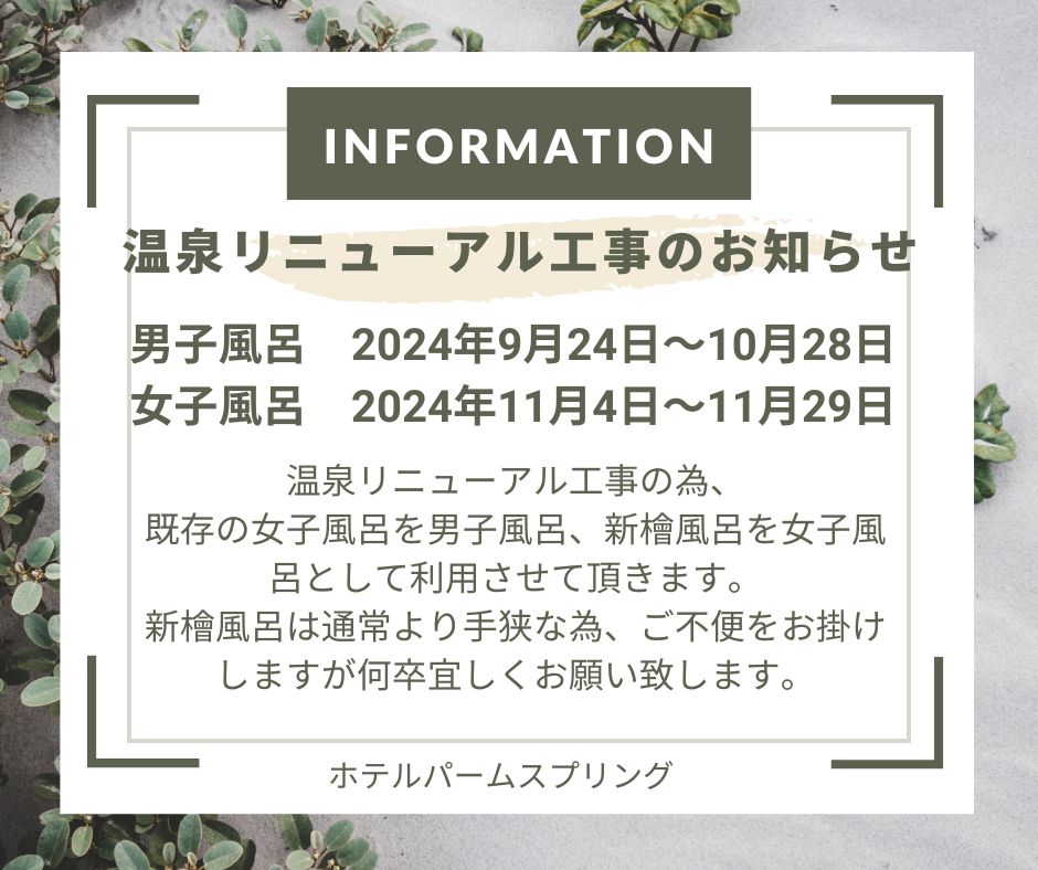 【館内メンテナンス】※温泉リニューアル工事のお知らせ※