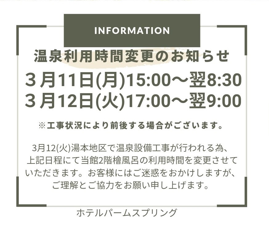 地区の温泉工事に伴い当館の2階檜風呂の利用時間が変更になります。