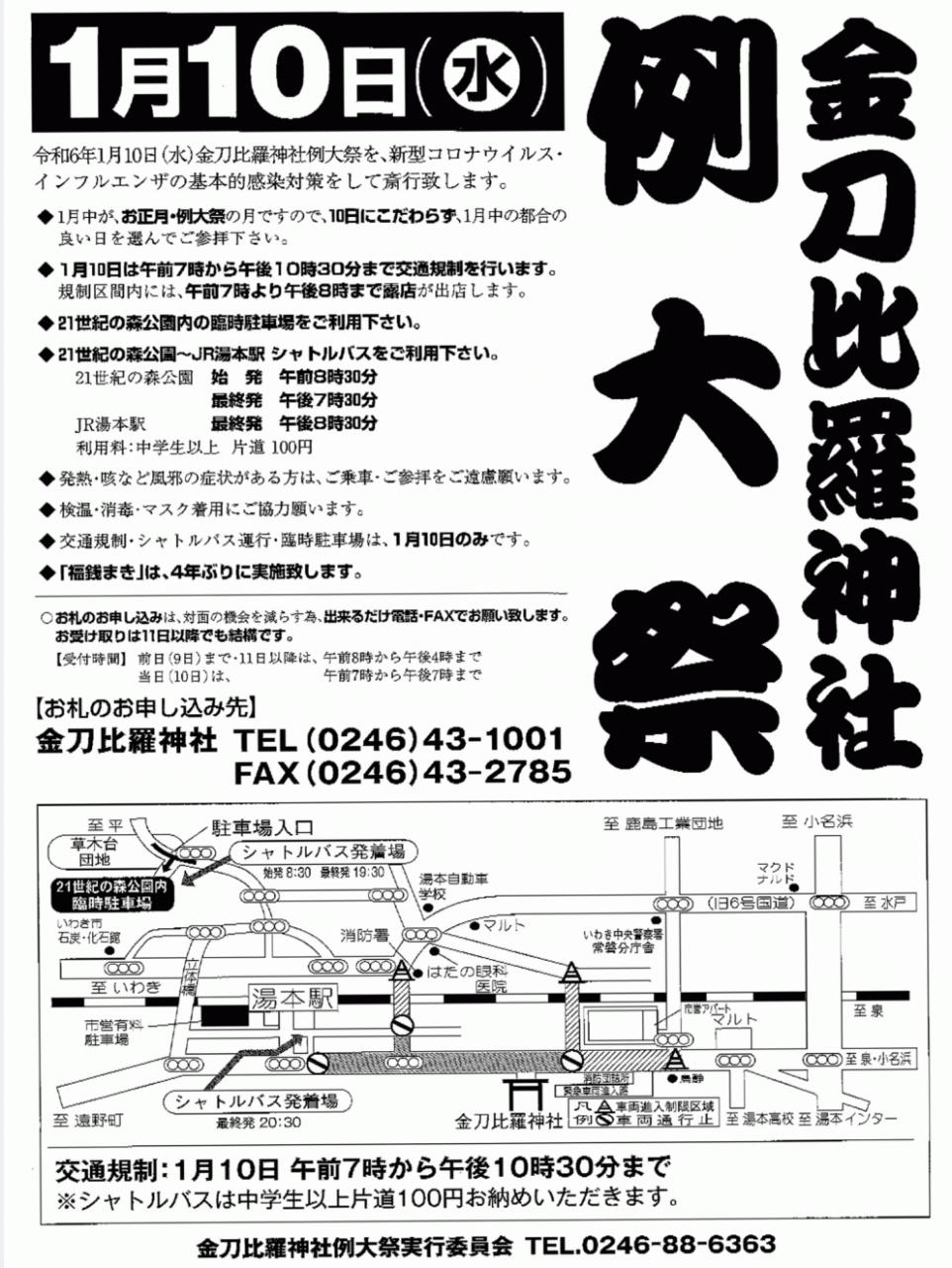 当日はJR湯本駅から金刀比羅神社境内までの約2キロが車両通行止になりますのでご注意下さい。