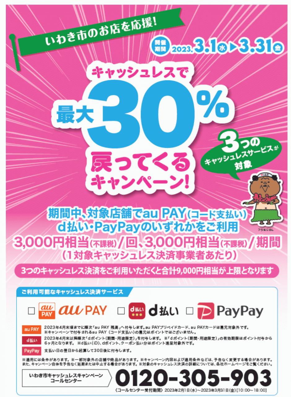 いわき市のお店を応援!キャッシュレスで最大30%戻ってくるキャンペーンが3月1日より実施されます。