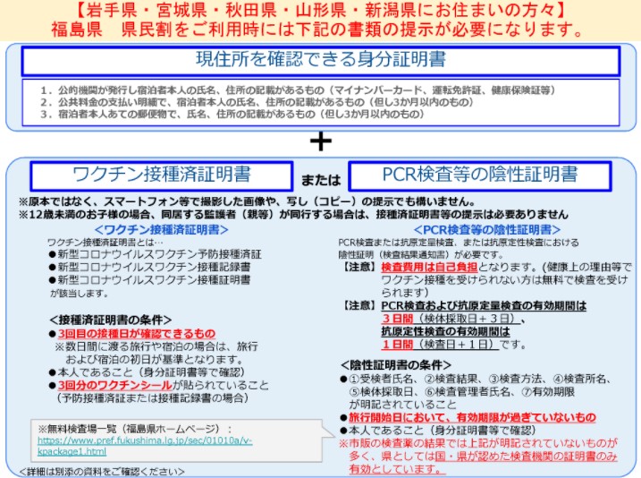 3.福島県内在住である身分証明書・対象県在住者である身分証明書&ワクチン接種券(福島県内在住2回接種・県外在住者3回県)をチェックイン時にご提示下さい。